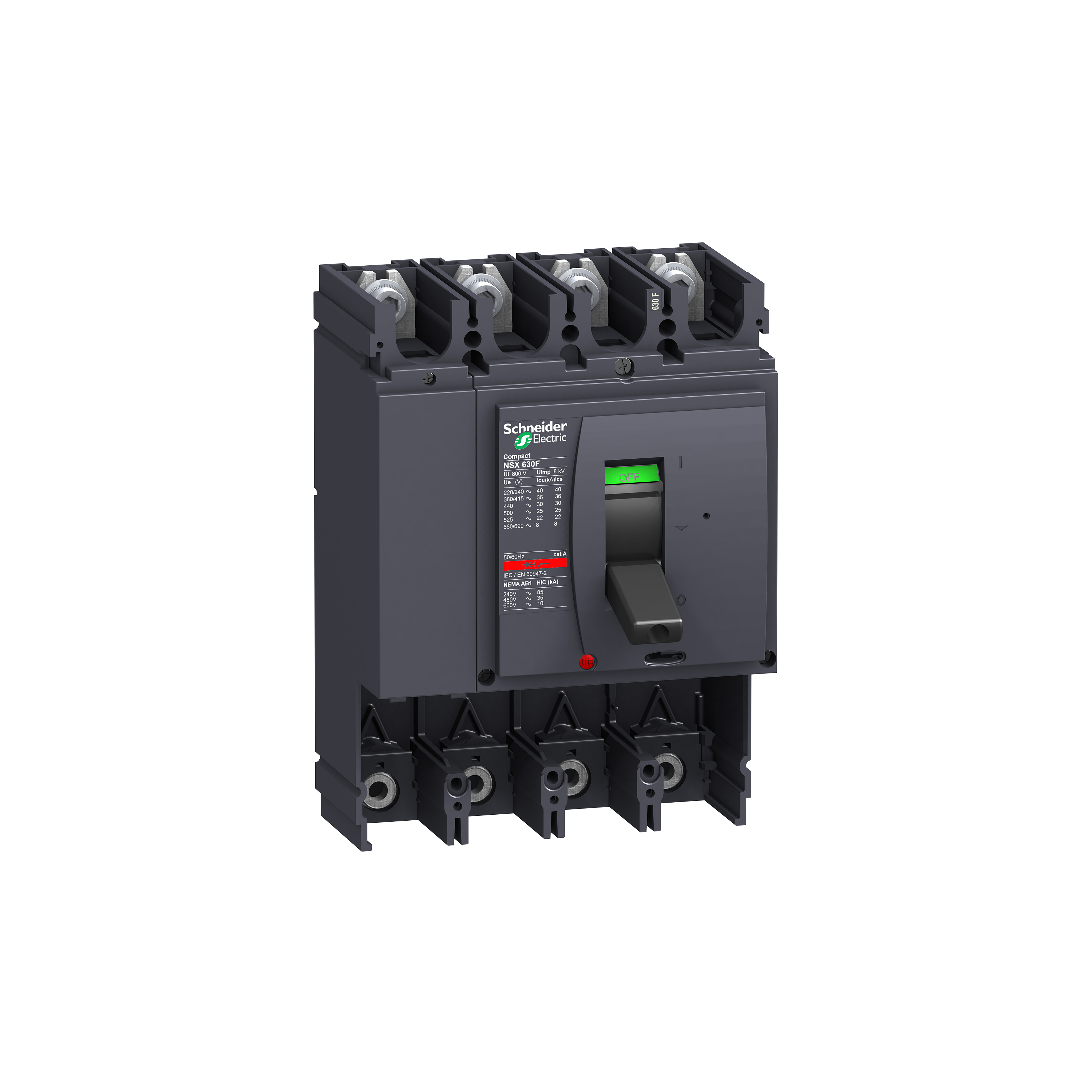 circuit breaker Compact NSX630N - 630 A - 4 poles - without trip unit. Label: Compact NSX 630A - range: Compact - network type: AC - network frequency: 50/60 Hz - [In] rated current: 630 A at 40 °C - [Ui] rated insulation voltage: N/A - [Uimp] rated impulse withstand voltage: N/A - range of product: NSX400...630 - [Ue] rated operational voltage: N/A - breaking capacity code: N - breaking capacity: N/A, N/A, N/A, N/A, N/A, N/A, N/A, N/A, N/A - suitability for isolation: yes conforming to EN 60947-2, yes conforming to IEC 60947-2 - utilisation category: category A - product name: Compact NSX - product or component type: basic frame - pollution degree: 3 conforming to IEC 60947-1 - device short name: Compact NSX630N - device application: distribution - circuit breaker name: Compact NSX630N - poles description: 4P - neutral position: left - Range Presentation: The Compact NSX combines intelligent metering and monitoring with impeccable protective functions. Features include: - Nominal current: 16 to 630 A - Five breaking performances from 36 to 150 kA at 415 V - Voltage rating: up to 690 V - Two physical sizes from 16 to 630 A - 3 and 4 pole versions available - Isolation with positive break indication - Large range of electronic and thermal-magnetic protections - Earth leakage protection by associated Vigi Module - Measure of main electrical values: I, U, P, E, THD, f, CosF - Wide range of common auxiliaries and accessories interchangeable on site - Plug and play wiring system and communicating accessories - Compliance with international standards: IEC 60947-1 and 2, Nema, IEC 68230 for type 2 tropicalisation, CCC - Compliance with specifications of marine classification companies: Bureau Veritas, Lloyd's Register of Shipping, Det Norske Veritas and RINA. - Range Benefits: Always first - Integrated power monitoring unit: Energy efficient - New breaking capacities: Performance - Interchangeable: Increased safety - Simple installation procedures: Easy to install - Range Application Presentation: - Commercial buildings - Hospitals - Steel industry - Marine