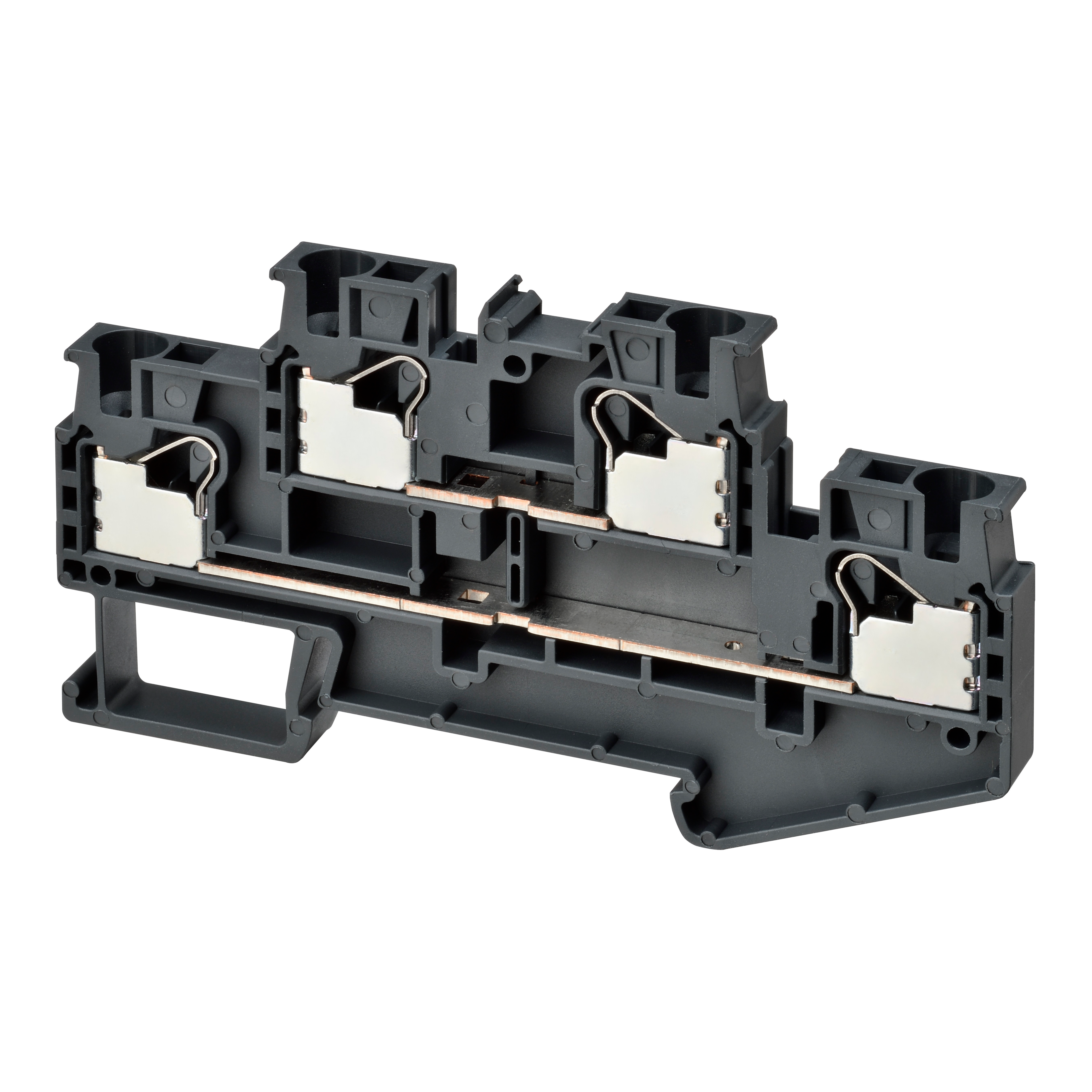 Multi-tier feed-through DIN rail terminal block with push-in plus connection for mounting on TS 35, nominal cross section 4 mm², color gray